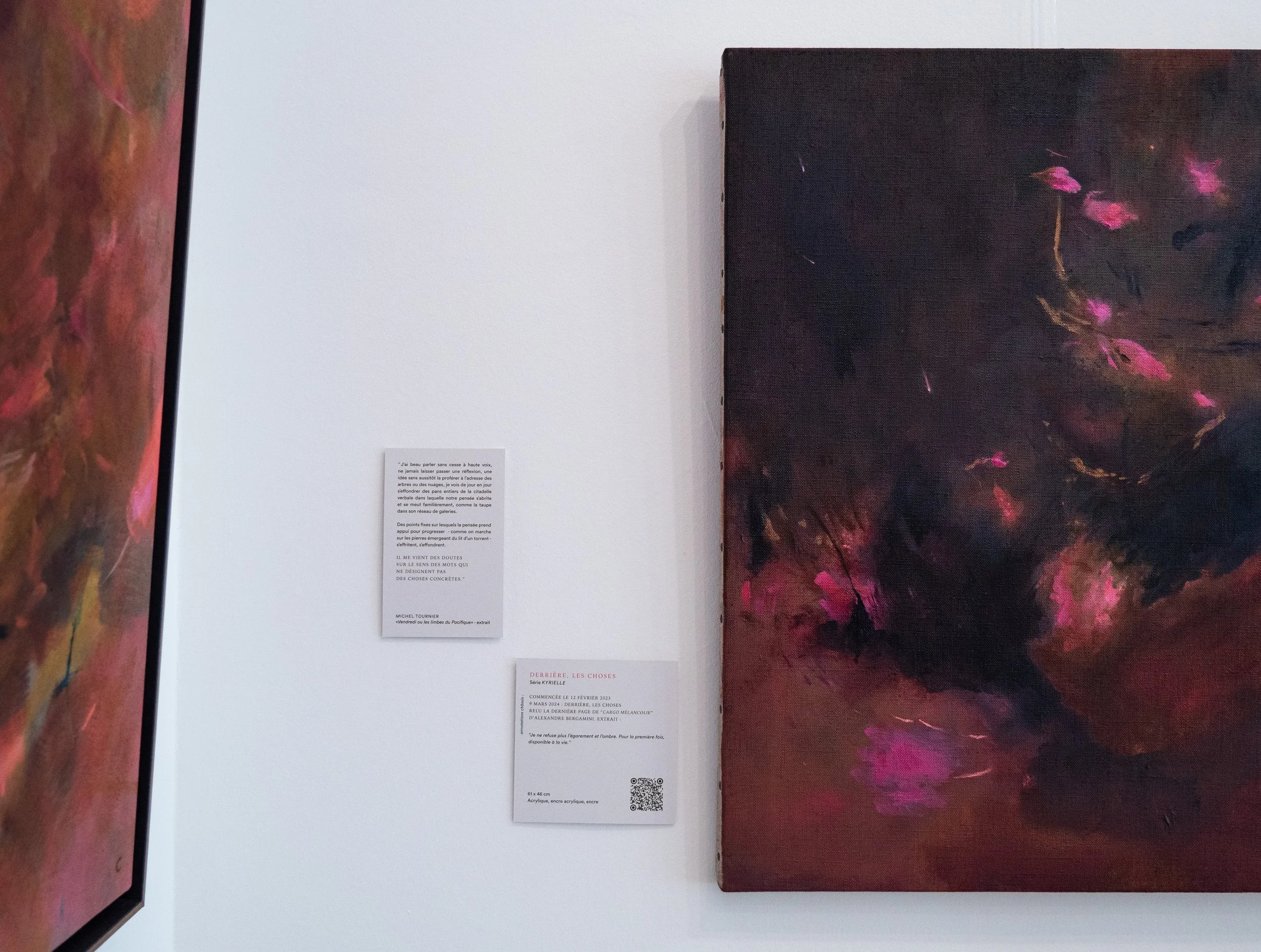 À travers l’exposition dont la série KYRIELLE a fait l’objet, j’ai souhaité partager une partie de ce qui m’aura interrogée, intéressée, émue et traversée pendant la période de création. Ainsi, les toiles agencées étaient ponctuées de matière variée : extraits de quelques-unes de mes lectures, poèmes personnels, haïkus, morceaux de musique, annotations…